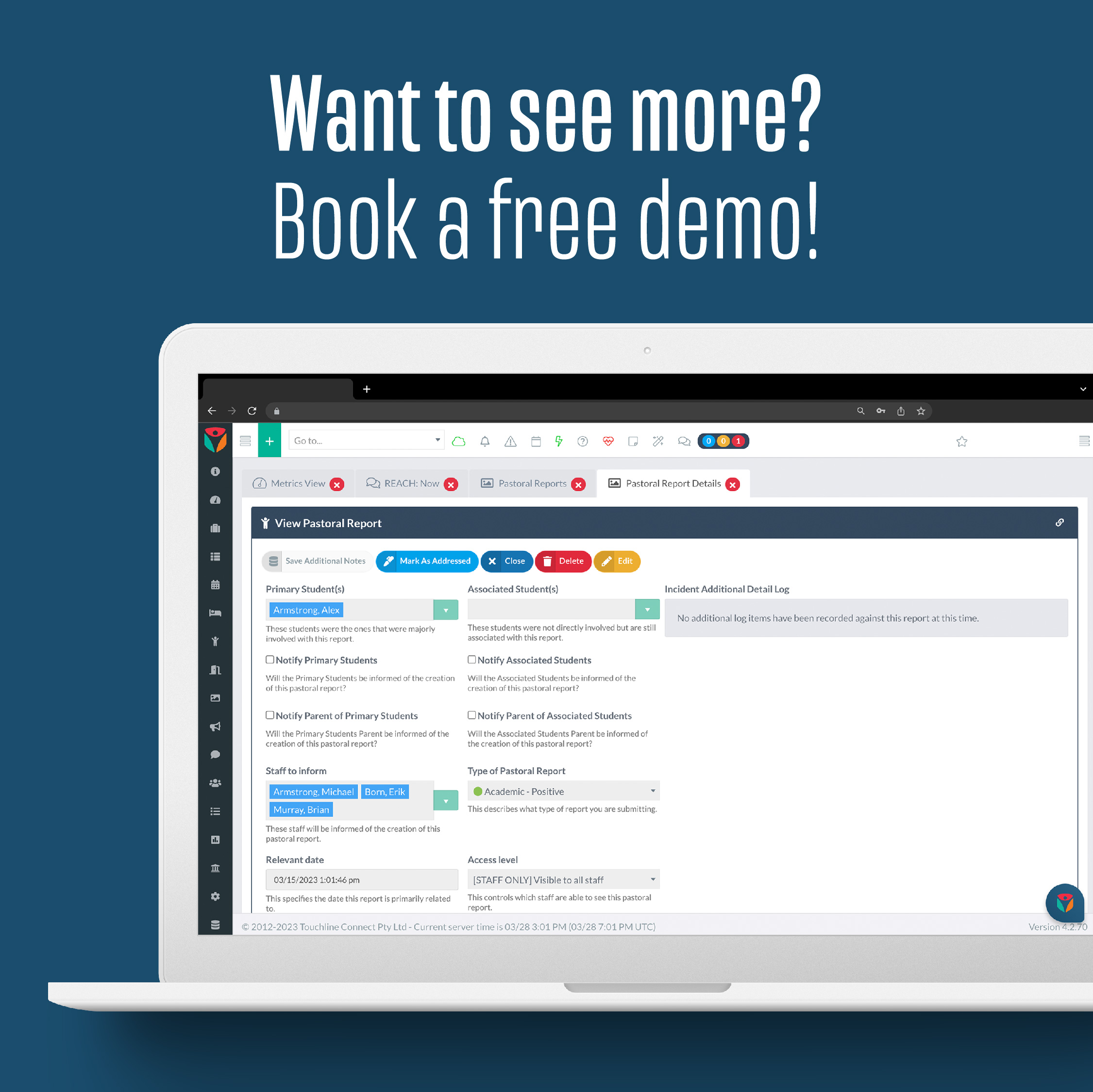 This tool provides a clear, comprehensive view of student behaviour over time, allowing staff to track incidents, create detailed reports, and assign wellbeing points with ease.